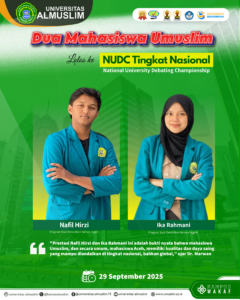 BIREUEN, 29 September 2025, Universitas Almuslim (Umuslim) kembali mengukir prestasi penting di kancah pendidikan tinggi nasional. Dua mahasiswa terbaiknya berhasil memastikan tiket ke National University Debating Championship (NUDC) Tingkat Nasional 2025, ajang kompetisi debat berbahasa Inggris paling bergengsi di Indonesia. Mereka adalah Nafil Hirzi (Semester III) dan Ika Rahmani (Semester VII), keduanya dari Program Studi Pendidikan Bahasa Inggris (PBI) Fakultas Keguruan dan Ilmu Pendidikan (FKIP) Umuslim. Kedua debater ini secara Read more