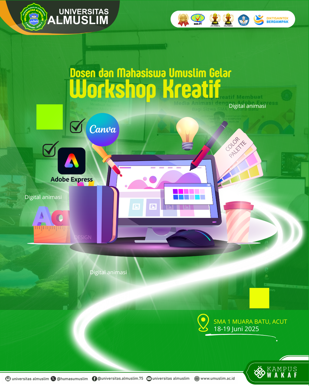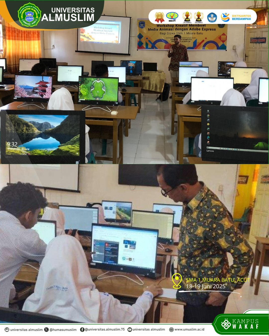 BIREUEN—Dalam upaya meningkatkan literasi teknologi dan mengembangkan potensi generasi muda di bidang industri kreatif digital, Universitas Almuslim (Umuslim) melalui Fakultas Ilmu Komputer (Fikom) Peusangan menggelar kegiatan pelatihan bertajuk “Workshop Kreatif: Membuat Animasi dengan Adobe Express” di SMAN 1 Muara Batu, Aceh Utara, selama dua hari berturut-turut, Rabu dan Kamis (18-19 Juni 2025).