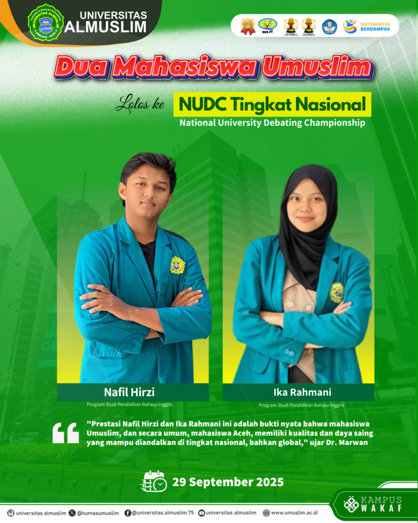 BIREUEN, 29 September 2025, Universitas Almuslim (Umuslim) kembali mengukir prestasi penting di kancah pendidikan tinggi nasional. Dua mahasiswa terbaiknya berhasil memastikan tiket ke National University Debating Championship (NUDC) Tingkat Nasional 2025, ajang kompetisi debat berbahasa Inggris paling bergengsi di Indonesia.