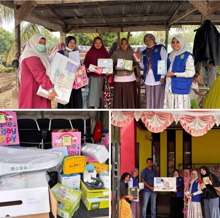 Dokumentasi foto penyerahan bantuan alat Posyandu di dua desa terdampak banjir oleh tim Fakultas Kesehatan Universitas Almuslim.