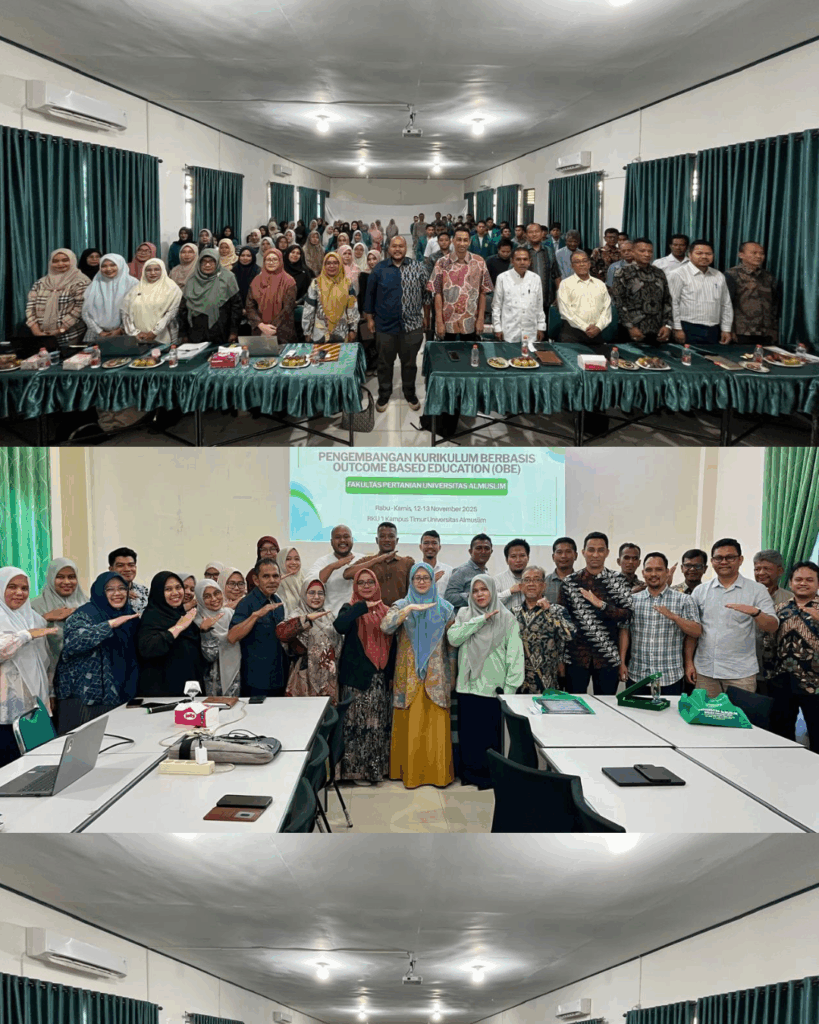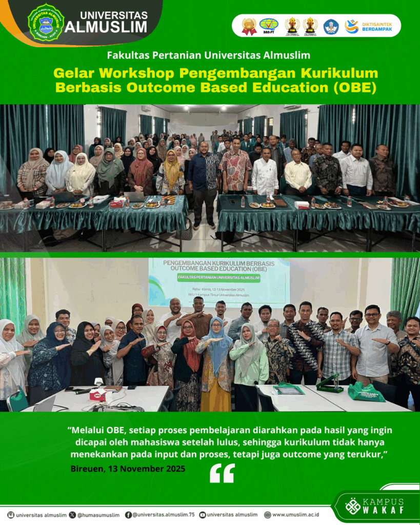 Bireuen, 13 November 2025 – Fakultas Pertanian Universitas Almuslim (FP-Umuslim) sukses menyelenggarakan Workshop Pengembangan Kurikulum Berbasis Outcome Based Education (OBE) selama dua hari, yakni pada Rabu dan Kamis, 12–13 November 2025, di RKU 1 Universitas Almuslim. Kegiatan ini bertujuan untuk memperkuat mutu pembelajaran dan menyiapkan lulusan yang kompeten, adaptif, serta sesuai dengan tuntutan dunia kerja dan perkembangan global.