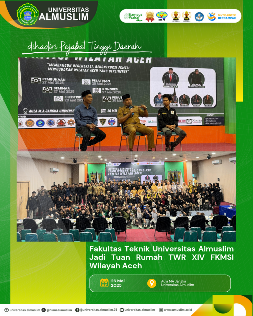 Matangglumpangdua Bireuen – Fakultas Teknik Universitas Almuslim kembali dipercaya sebagai tuan rumah pelaksanaan Temu Wicara Regional (TWR) XIV Forum Komunikasi Mahasiswa Teknik Sipil Indonesia (FKMTSI) Wilayah Aceh. Kegiatan ini resmi dibuka dalam sebuah upacara yang berlangsung meriah dan penuh khidmat di Aula MA Jangka Universitas Almuslim, (26/5).