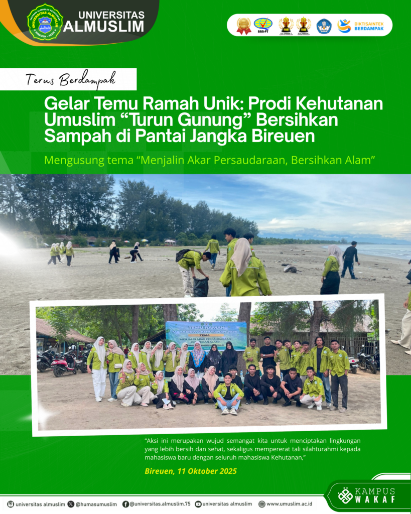 Bireuen, 11 Oktober 2025 – Program Studi (Prodi) Kehutanan Universitas Almuslim (Umuslim) sukses melaksanakan kegiatan temu ramah sekaligus aksi bersih-bersih Sampah di bibir Pantai Jangka Masjid, Kecamatan Jangka, Kabupaten Bireuen, pada Sabtu (11/10/2025).