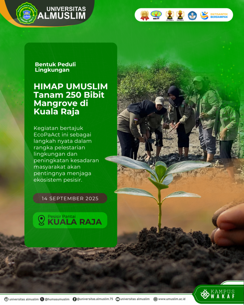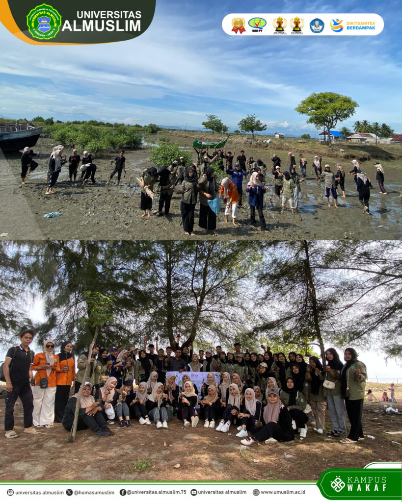 Kuala Raja, 14 September 2025 — Himpunan Mahasiswa Administrasi Publik (HIMAP) Universitas Al Muslim (UMUSLIM) menggelar kegiatan peduli lingkungan berupa penanaman 250 bibit mangrove di pesisir Desa Kuala Raja, Kecamatan Kuala, Kabupaten Bireuen. Kegiatan yang bertajuk EcoPaAct ( Ecological Public Administration Action) ini merupakan bentuk nyata kepedulian mahasiswa terhadap pelestarian lingkungan, khususnya dalam upaya menjaga ekosistem pesisir.