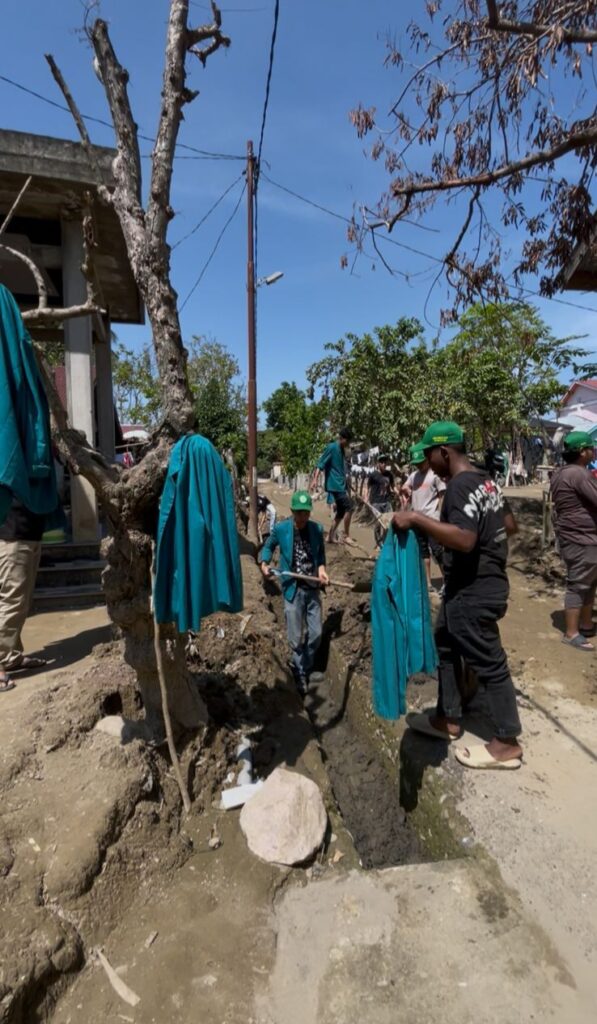 Bireuen_ Mahasiswa Kuliah Kerja Mahasiswa (KKM) dari Universitas Almuslim (UMUSLIM) turut berperan aktif dalam kegiatan pembersihan saluran air yang tersumbat pasca bencana banjir di Gampong Putoh, Kecamatan Samalanga, Kabupaten Bireuen.(2/2/2026)
