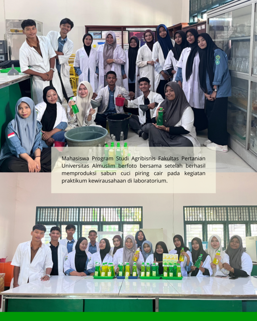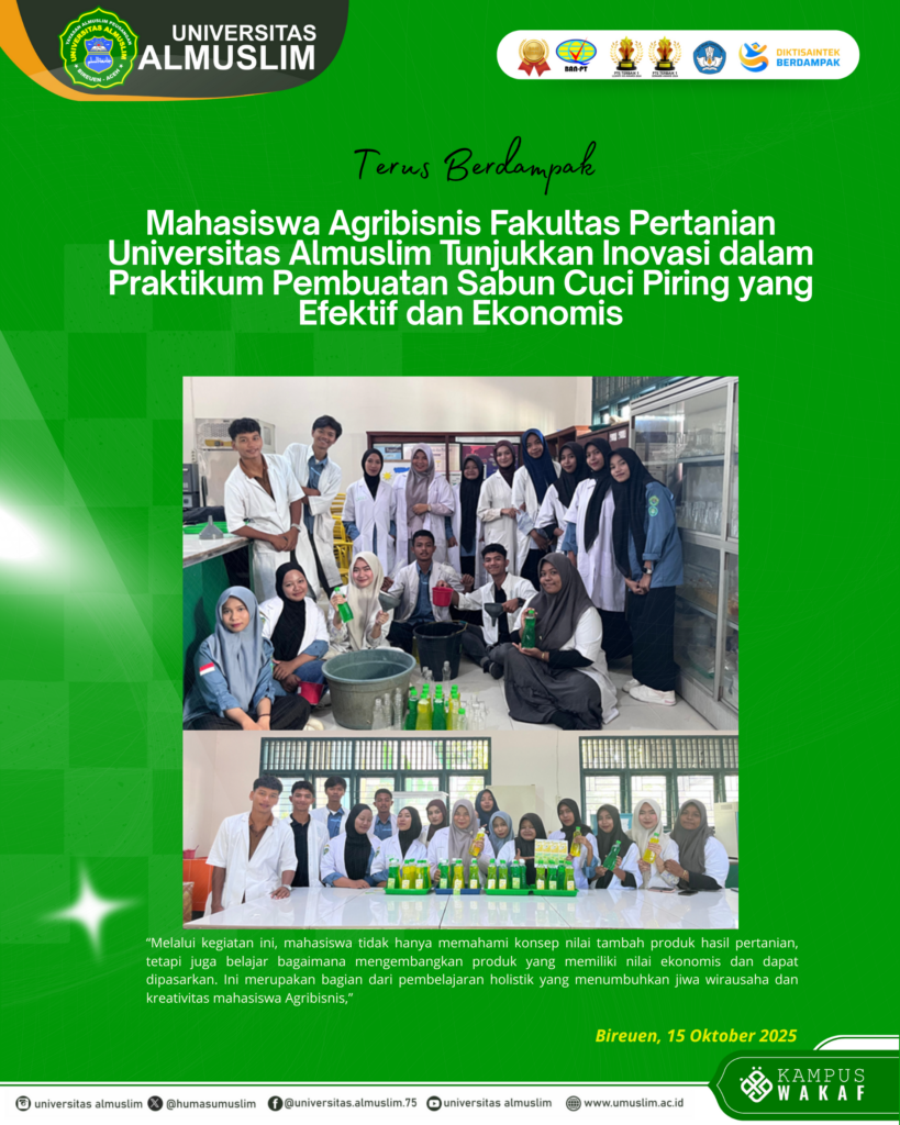 Bireuen, 15 Oktober 2025 Mahasiswa Program Studi Agribisnis Fakultas Pertanian Universitas Almuslim kembali menunjukkan kreativitas dan inovasinya melalui kegiatan praktikum berbasis proyek (project-based learning) yang menghasilkan produk sabun cuci piring cair. Kegiatan ini menjadi bagian dari upaya pengembangan kompetensi kewirausahaan mahasiswa yang berorientasi pada produk agribisnis bernilai tambah dan ramah lingkungan.
