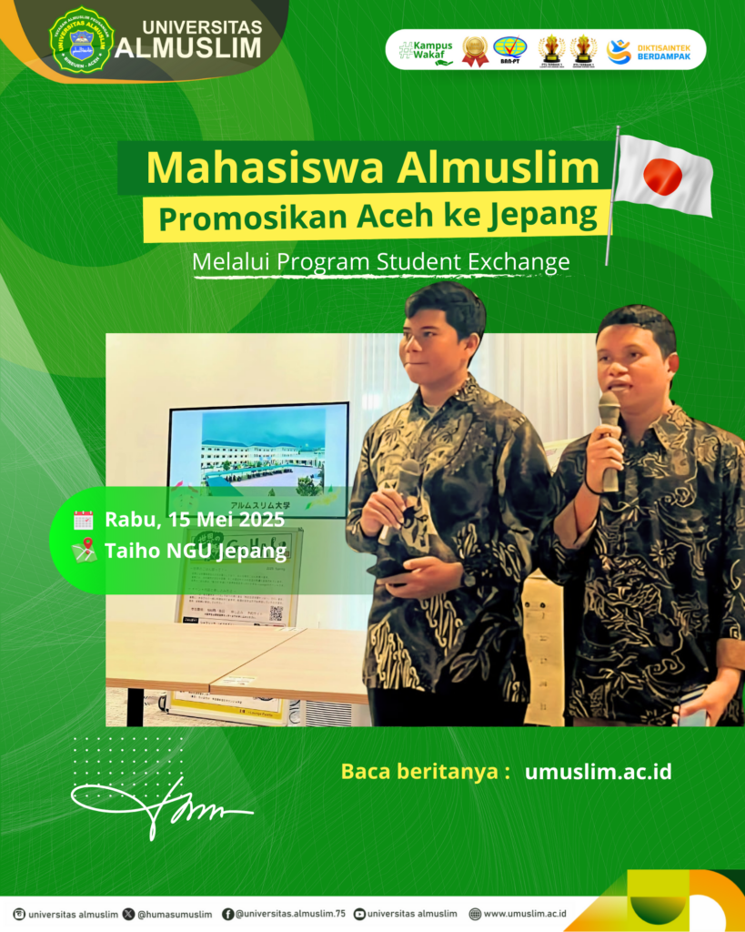 NGU JEPANG_ Muhammad Syawal, mahasiswa semester enam dari Program Studi Pendidikan Bahasa Inggris Fakultas Keguruan dan Ilmu Pendidikan (FKIP) Universitas Almuslim, tengah menorehkan prestasi dalam program pertukaran pelajar di Nagoya Gakuin University (NGU), Jepang. Melalui kegiatan ini, Syawal berkesempatan mempromosikan kekayaan budaya dan alam Aceh dalam ajang internasional I-Festa 15 Mei 2025.