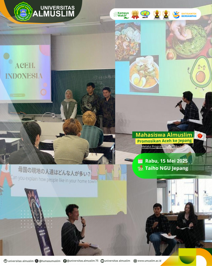Dalam presentasinya, Syawal tidak hanya menampilkan keindahan alam Aceh, tetapi juga memperkenalkan Universitas Almuslim sebagai perguruan tinggi ternama di Aceh. Ia mengungkapkan bahwa struktur universitas tersebut memiliki kesamaan dengan NGU dan mengundang mahasiswa Jepang untuk berkunjung ke kampus di Aceh. “Kami berharap mereka tertarik dan berkunjung ke Aceh untuk mengenal lebih dekat universitas dan budaya kami,” tambahnya.