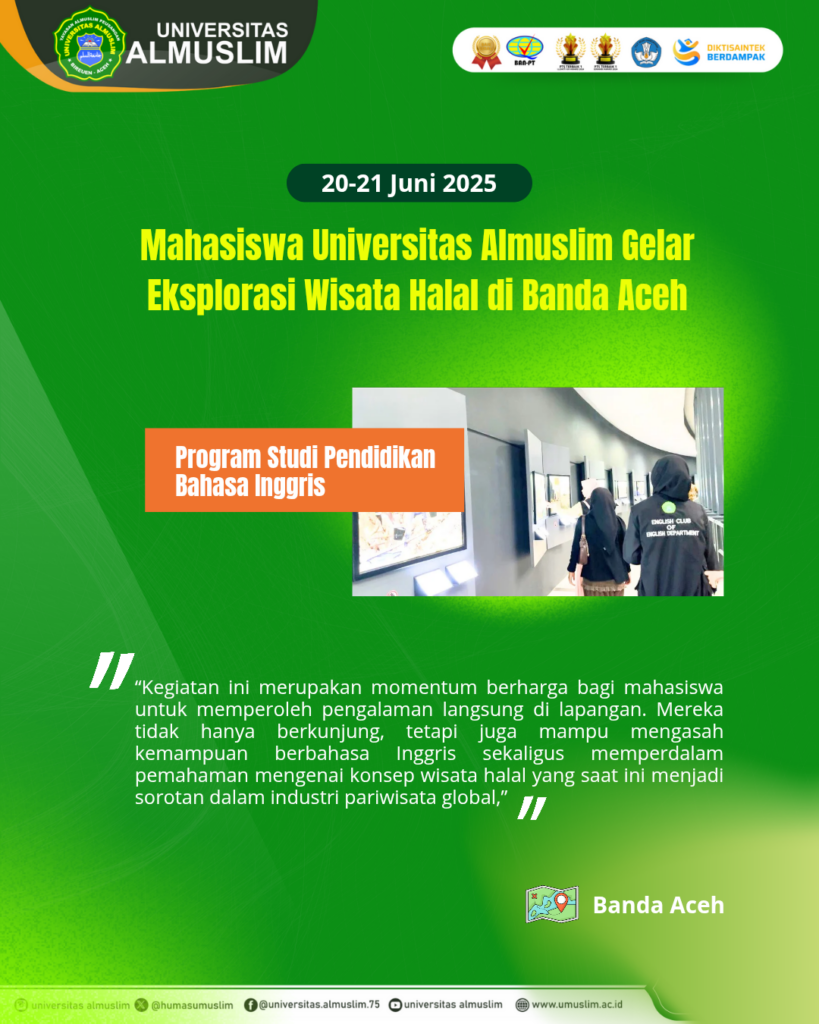 BANDA ACEH – Mahasiswa Universitas Almuslim (Umuslim) semester VI Program Studi Pendidikan Bahasa Inggris Fakultas Keguruan dan Ilmu Pendidikan (FKIP) melaksanakan kegiatan kunjungan lapangan ke sejumlah destinasi wisata halal di Banda Aceh, Jumat (20/6). Kegiatan ini merupakan bagian dari mata kuliah *English for Halal Tourism* (EFHT) yang dilaksanakan selama dua hari, 20 dan 21 Juni 2025.