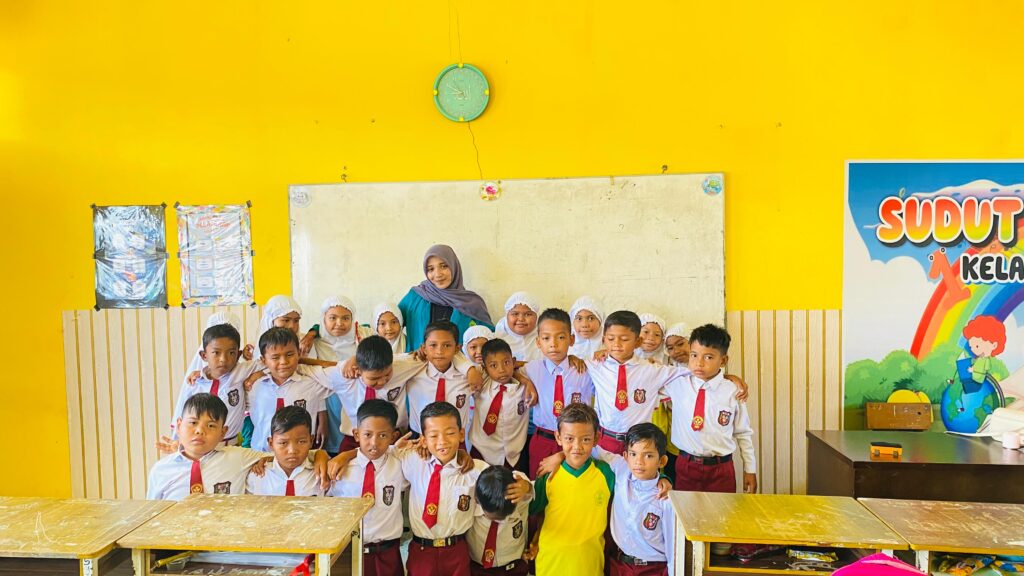 Dokumentasi foto bersama mahasiswa KKM Universitas Almuslim Nadilla Fadilla dengan siswa SD Negeri 10 Peusangan usai kegiatan.