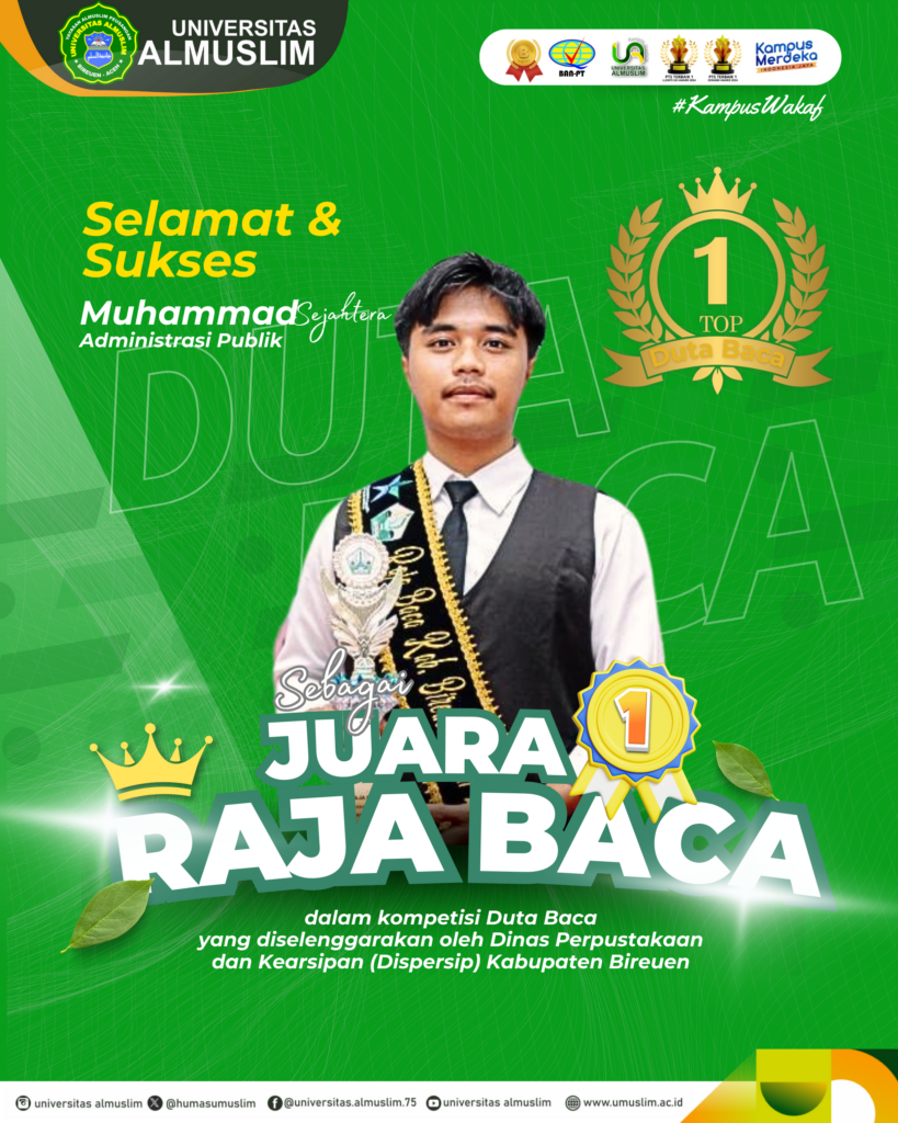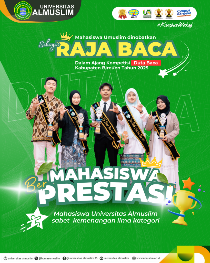 Bireuen, – Salah satu mahasiswa Universitas Almuslim (Umuslim) berhasil menorehkan prestasi gemilang dengan meraih predikat Raja Baca dalam kompetisi Duta Baca yang diselenggarakan oleh Dinas Perpustakaan dan Kearsipan (Dispersip) Kabupaten Bireuen. Acara kompetisi ini berlangsung di Aula Lama Setdakab Bireuen pada hari Rabu, 30 April 2025.