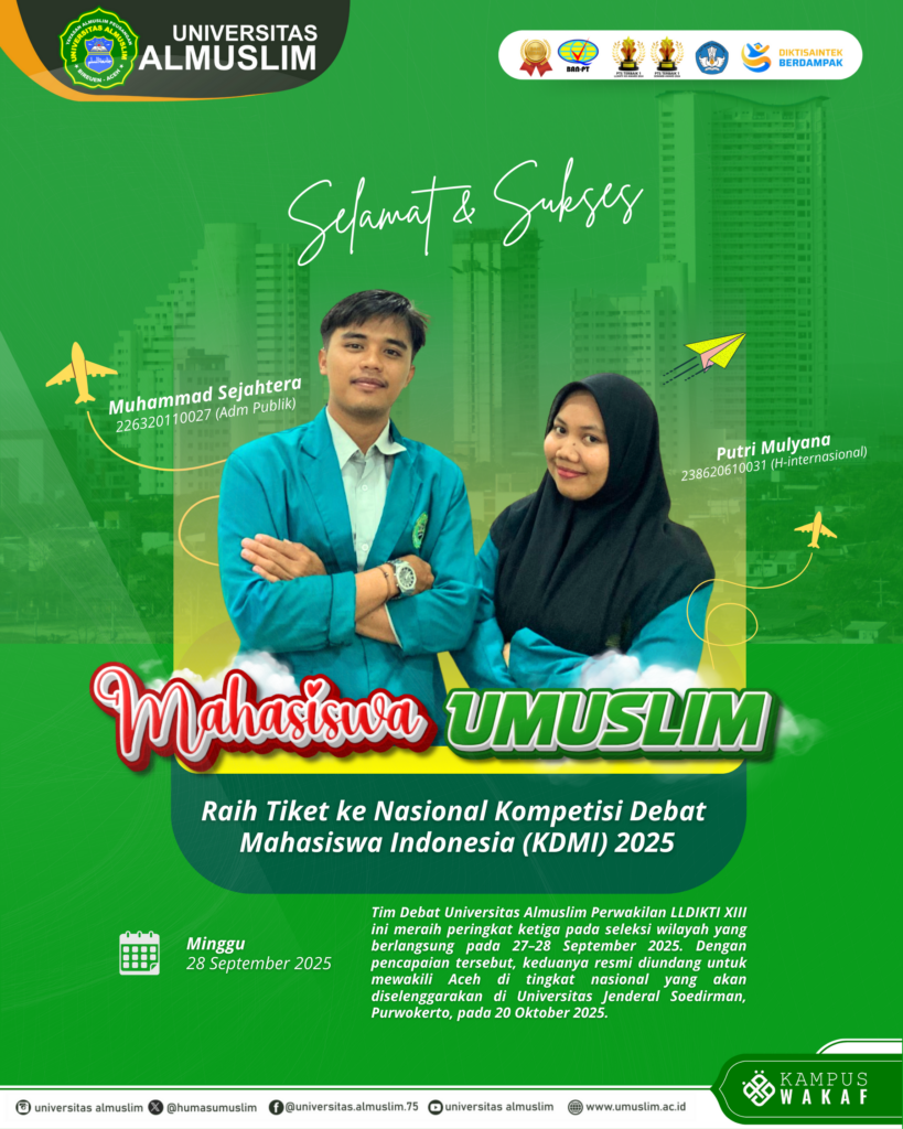 Banda Aceh, 28 September 2025 — Dua mahasiswa Universitas Almuslim, Muhammad Sejahtera dan Putri Mulyana dari Fakultas Ilmu Sosial dan Ilmu Politik, berhasil menunjukkan prestasi gemilang di tingkat nasional dengan meraih posisi ketiga dalam seleksi wilayah Kompetisi Debat Mahasiswa Indonesia (KDMI) 2025.