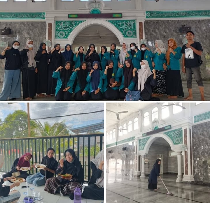 Dokumentasi foto mahasiswa Universitas Almuslim yang dikoordinir Dr. Zahriyanti, S.Pd.I., MA, membersihkan Masjid Jamik Al-Izzah Krueng Mane, Kecamatan Muara Batu, Kabupaten Aceh Utara pada Kamis (11/12/2025).