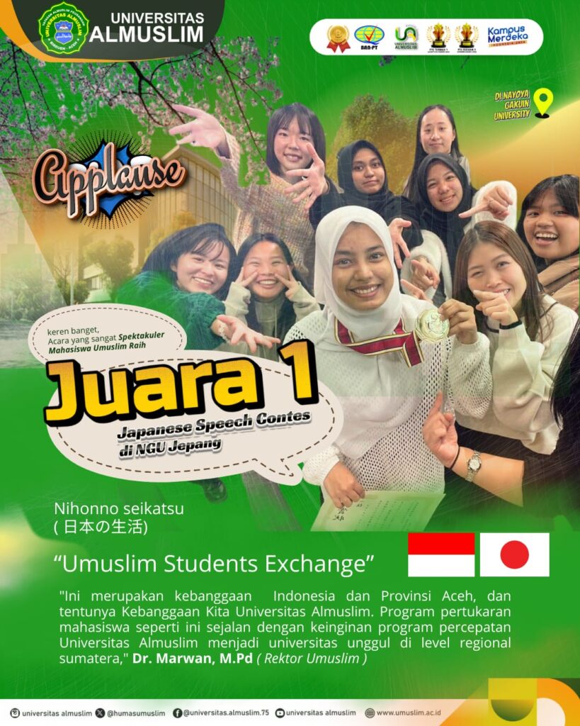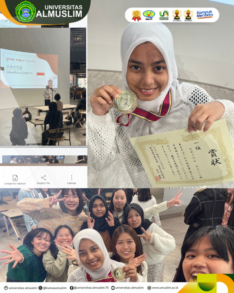 Nagoya, Jepang, Raihan Adiani, Mahasiswa Universitas Almuslim (Umuslim) berhasil Menjuarai Kontes Pidato Bahasa Jepang yang digelar di Nagoya Gakuin University (NGU) Jepang pada 3 Desember 2024 lalu. Raihan berhasil menyisihkan enam finalis lainnya yang berasal Amerika Serikat, Taiwan, dan negara lainnya.