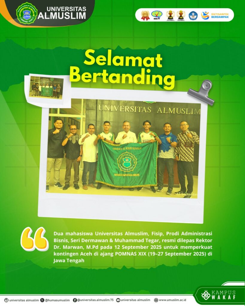 Bireuen, 12 September 2025 – Dua mahasiswa dari Universitas Almuslim, Seri Dermawan dan Muhammad Tegar, resmi dilepas oleh Rektor Dr. Marwan, M.Pd untuk mengikuti ajang Pekan Olahraga Mahasiswa Nasional (POMNAS) XIX yang berlangsung di Jawa Tengah pada 19–27 September 2025. Pelepasan yang berlangsung meriah ini menandai langkah mereka dalam memperkuat kontingen Aceh di level nasional.