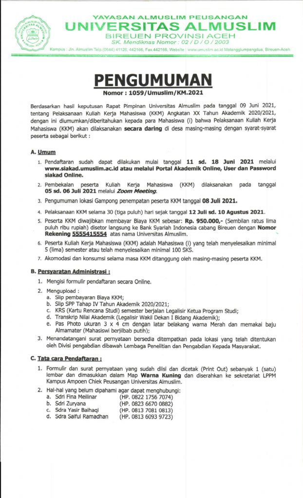 Pelaksanaan Kuliah Kerja Mahasiswa (KKM) Universitas Almuslim Angkatan XX Tahun Akademik 2020/2021, dilaksanakan secara daring di desa masing-masing, demikian hasil keputusan rapat pimpinan pada tanggal 09 Juni 2021.