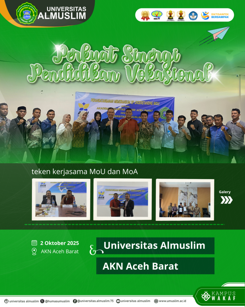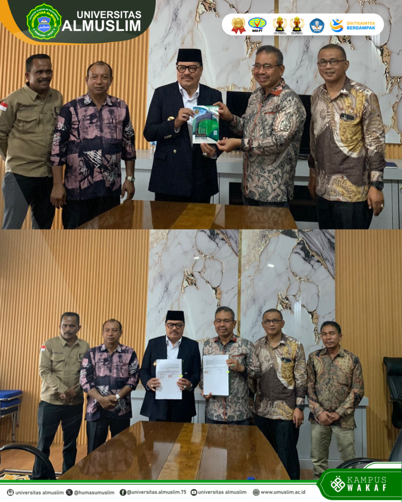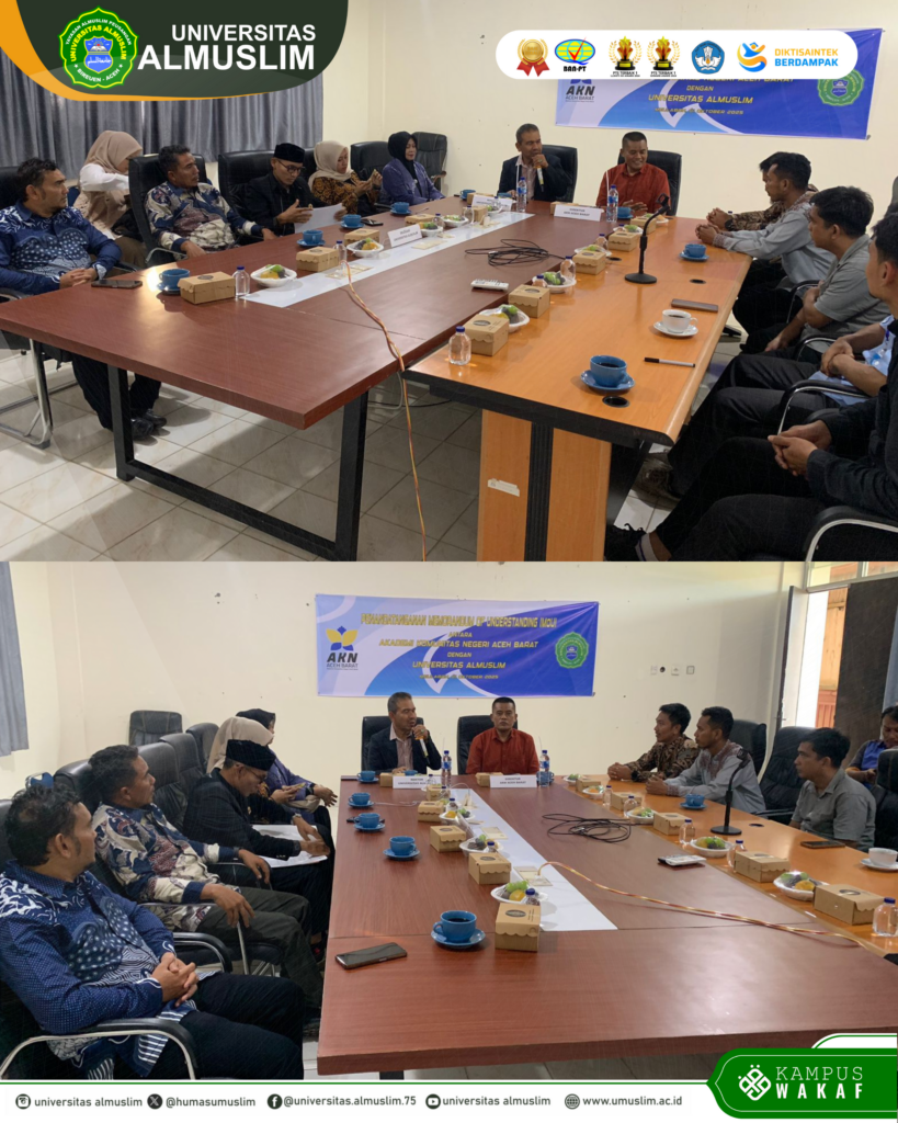 Umuslim dan AKN Aceh Barat tandatangan MoU, perkuat sinergi pendidikan vokasional melalui Fakultas Teknik Bireuen – Kerjasama antara Universitas Almuslim (Umuslim) dengan Akademi Komunitas Negeri (AKN) Aceh Barat semakin diperkuat melalui penandatanganan Memorandum of Understanding (MoU) yang dilaksanakan di kampus AKN di Meulaboh, Aceh Barat. MoU tersebut ditandatangani langsung oleh Rektor Universitas Almuslim, Dr. Marwan, M.Pd, dan Direktur AKN Aceh Barat, Zulfan Khairil Simbolon, S.T., M.Eng.