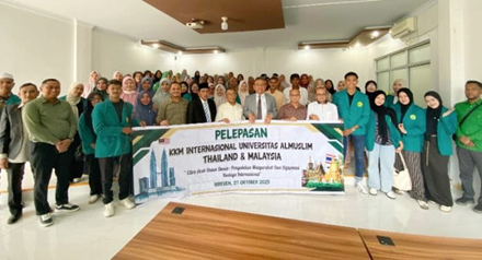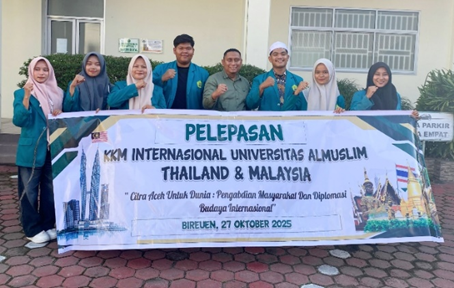Rektor Universitas Almuslim (Umuslim) Bireuen, melepas sejumlah mahasiswa kampus tersebut yang terpilih melaksanakan Kuliah Kerja Mahasiswa (KKM) Tematik Internasional di Malaysia dan Thailand tahun 2025.