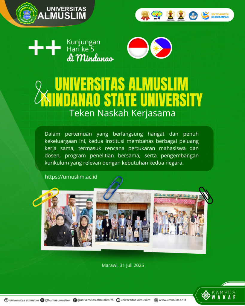 “Alhamdulillah, kami dari Universitas Almuslim sangat bersyukur dan bersemangat atas kunjungan resmi ini ke Mindanao State University di Marawi City. Kunjungan ini merupakan langkah strategis dalam mempererat hubungan dan memperluas jaringan kerjasama antar kedua institusi pendidikan yang memiliki visi dan misi yang sejalan.