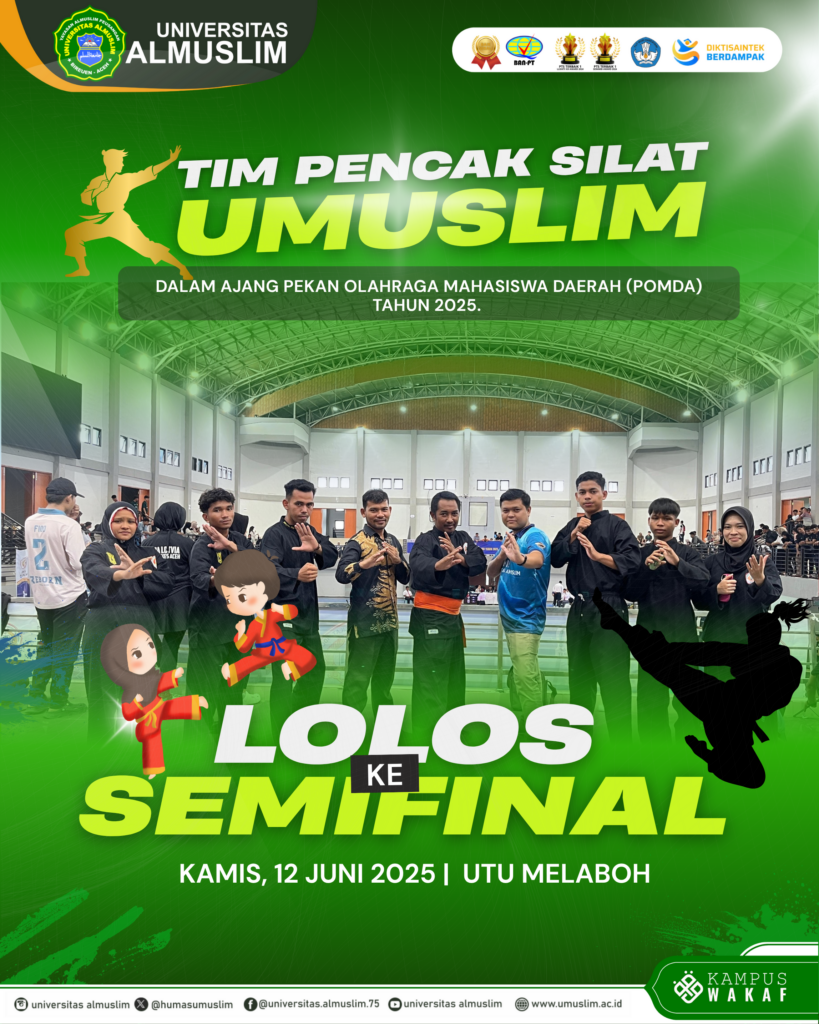 Melaboh — Tim pencak silat Universitas Almuslim (Umuslim) berhasil melangkah ke babak semifinal Pekan Olahraga Mahasiswa Daerah (POMDA) Tahun 2025 yang berlangsung di Universitas Teuku Umar (UTU). Prestasi ini diraih setelah melalui pertandingan ketat dan penuh perjuangan di hari ketiga pelaksanaan kompetisi.