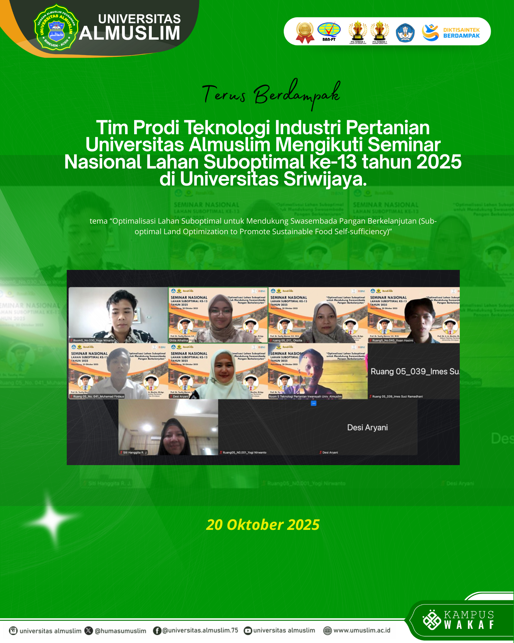 Bireuen, 20 Oktober 2025 — Universitas Almuslim kembali menorehkan prestasi membanggakan. Melalui tim dari Program Studi Teknologi Industri Pertanian, universitas ini mewakili Bireuen dalam Seminar Nasional Lahan Suboptimal ke-13 yang digelar secara daring di Universitas Sriwijaya, Sumatera Selatan.