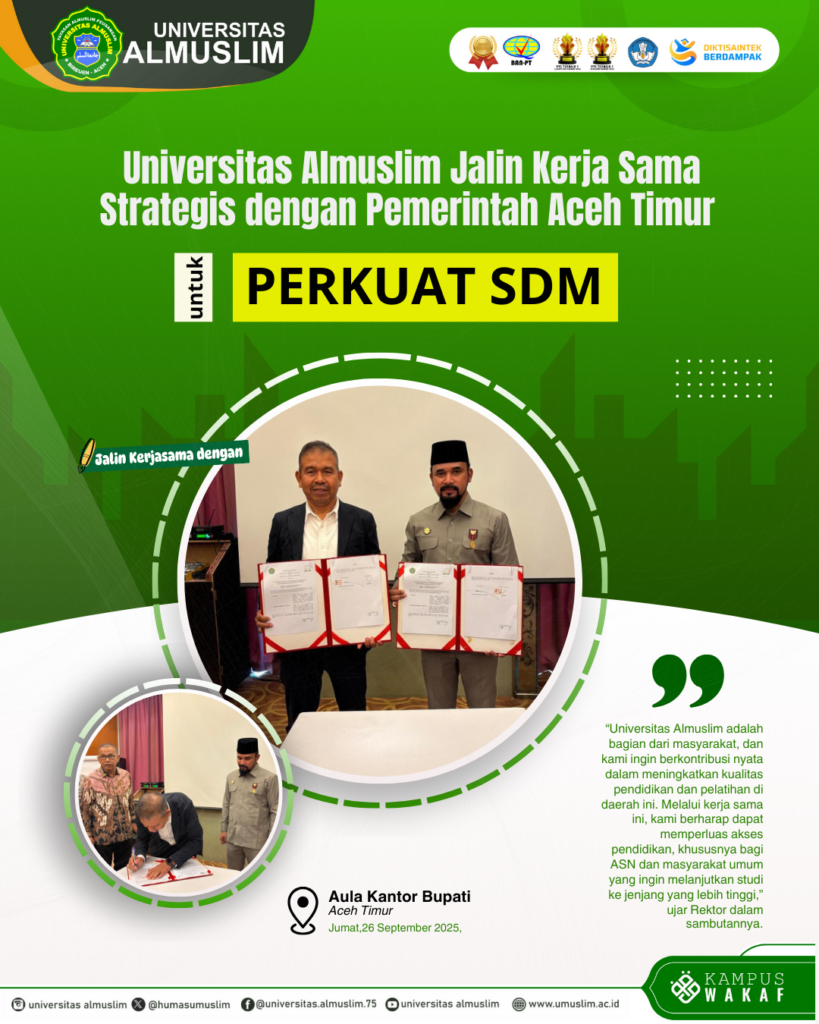 ACEH TIMUR — Jumat, 26 September 2025, menjadi hari bersejarah bagi dunia pendidikan di Aceh Timur. Universitas Almuslim, salah satu perguruan tinggi terkemuka di Aceh, melakukan kunjungan kerja sekaligus penandatanganan nota kesepahaman dengan Pemerintah Kabupaten Aceh Timur dalam rangka mendukung pengembangan sumber daya manusia di daerah berjuluk Bumi Muda Sedia.