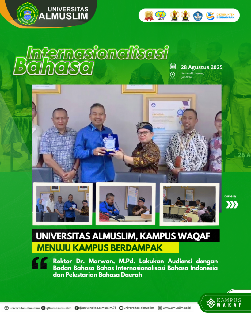 Jakarta, 28 Agustus 2025 — Sebagai kampus waqaf yang berkomitmen menjadi pusat pendidikan yang membawa manfaat luas bagi masyarakat, Universitas Almuslim (Umuslim) terus memperkuat langkah strategisnya dalam mewujudkan program nasional Kampus Berdampak. Salah satunya diwujudkan melalui audiensi resmi yang dilakukan oleh Rektor Universitas Almuslim, Dr. Marwan, M.Pd., bersama jajaran pimpinan universitas ke Badan Pengembangan dan Pembinaan Bahasa, Kementerian Pendidikan Dasar dan Menengah (Kemendikdasmen) di Jakarta.